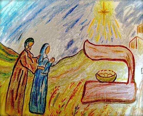 « Beth », la première lettre du Sepher Bereshit, c’est la « maison », le lieu de la création, le lieu de tout. Et ils se retrouvent, Mariam et lui son époux, à la veille de l’Enfantement, justement à Beth-Lehem, « maison-du-pain », la maison de David.